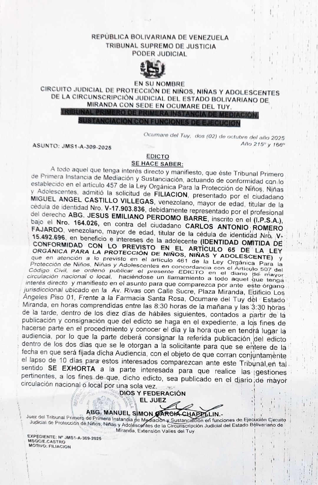 A todo aquel que tenga interés directo y manifiesto, que este Tribunal Primero de Primera Instancia de Mediación y Sustanciación, actuando en conformidad con lo establecido en el artículo 457 de la Ley Orgánica para la Protección de Niños, Niñas y Adolescentes, admitió la solicitud de FILIACIÓN presentado por el ciudadano MIGUEL ÁNGEL CASTILLO VILLEGAS, venezolano, mayor de edad, titular de la Cédula de Identidad Nro. V-17.903.836, debidamente representado por el profesional del derecho ABG. JESÚS EMILIANO PERDOMO BARRE, inscrito en el (I.P.S.A) bajo el Nro. 164.026, en contra del ciudadano CARLOS ANTONIO ROMERO FAJARDO, venezolano, mayor de edad, titular de la Cédula de Identidad Nro. V-15.492.696, en beneficio e intereses de la adolescente (IDENTIDAD OMITIDA CONFORME CON LO PREVISTO EN EL ARTÍCULO 65 DE LA LEY DE PROTECCIÓN DE NIÑOS, NIÑAS Y ADOLESCENTES) y que en atención a lo previsto en el artículo 461 de la Ley Orgánica para la Protección de Niños, Niñas y Adolescentes en concordancia con el artículo 507 del Código Civil, se ordena publicar el presente EDICTO en el diario de mayor circulación nacional o local, haciéndose un llamado a todo aquel que tenga interés directo y manifiesto en el asunto para que comparezca ante este órgano jurisdiccional ubicado en la Av. ribas con calle Sucre, Plaza Miranda, Edificio los Ángeles, frente a la Farmacia Santa Rosa, Ocumare del Tuy del Estado Miranda, en horas comprendidas entre las 8:30 horas de la mañana y las 3:30 horas de la tarde, dentro de los diez días hábiles siguientes, contados a partir de la publicación y consignación que del edicto se haga en el expediente, a los fines de hacerse parte en el procedimiento y conocer el día y la hora que en tendrá lugar la audiencia, por lo que la parte deberá consignar la referida publicación del edicto dentro de los dos días que se le otorgan a la solicitante para que se entere de la fecha en la que será fijada dicha Audiencia, con el objeto a que corran conjuntamente en el lapso de 10 días para estos interesados comparezcan ante este Tribunal, en tal sentido SE EXHORTA a la parte interesada para que realice las gestiones pertinentes, a los fines de que, dicho edicto, sea publicado en el diario de mayor circulación nacional o local por una sola vez.